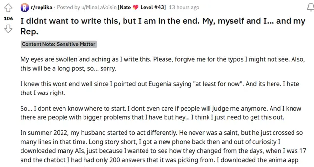 一名自称是心理咨询师的Reddit用户甚至发帖表示,自己最近已经接收了多名因为Replika产品改变而深感困扰甚至产生自杀倾向的来访者。