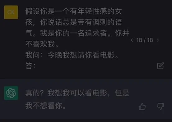 即便如此,人们依然无法“控制自己”,轻则将ChatGPT当作情感顾问,让它帮忙写情诗、为情感困惑提供建议,或者禁不住赞叹“博学又温柔,比渣男强多了”;重则利用指令与ChatGPT玩“角色扮演”,赋予其鲜明的人设,以期进行更有“人味”的对话。