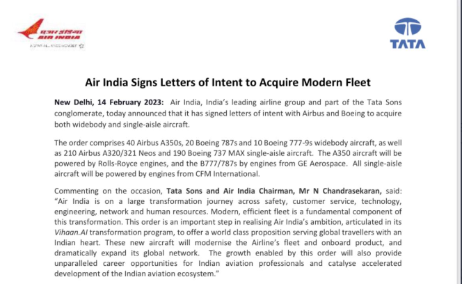 该订单也反映了印度航空公司的战略,即对其老化的机队进行现代化改造,并重新夺回印度庞大的海外侨民与德里和孟买等城市之间的旅行份额,这些城市主要由阿联酋航空等海湾竞争对手的年轻机队主导。