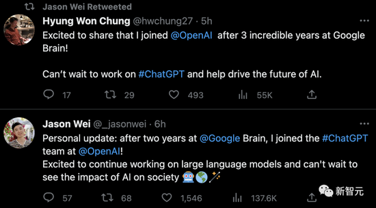 今天,两位前Google员工Jason Wei和Hyung Won Chuang仿佛约好了一般,前后脚宣布从Google大脑离职、入职OpenAI,还互相转了推。