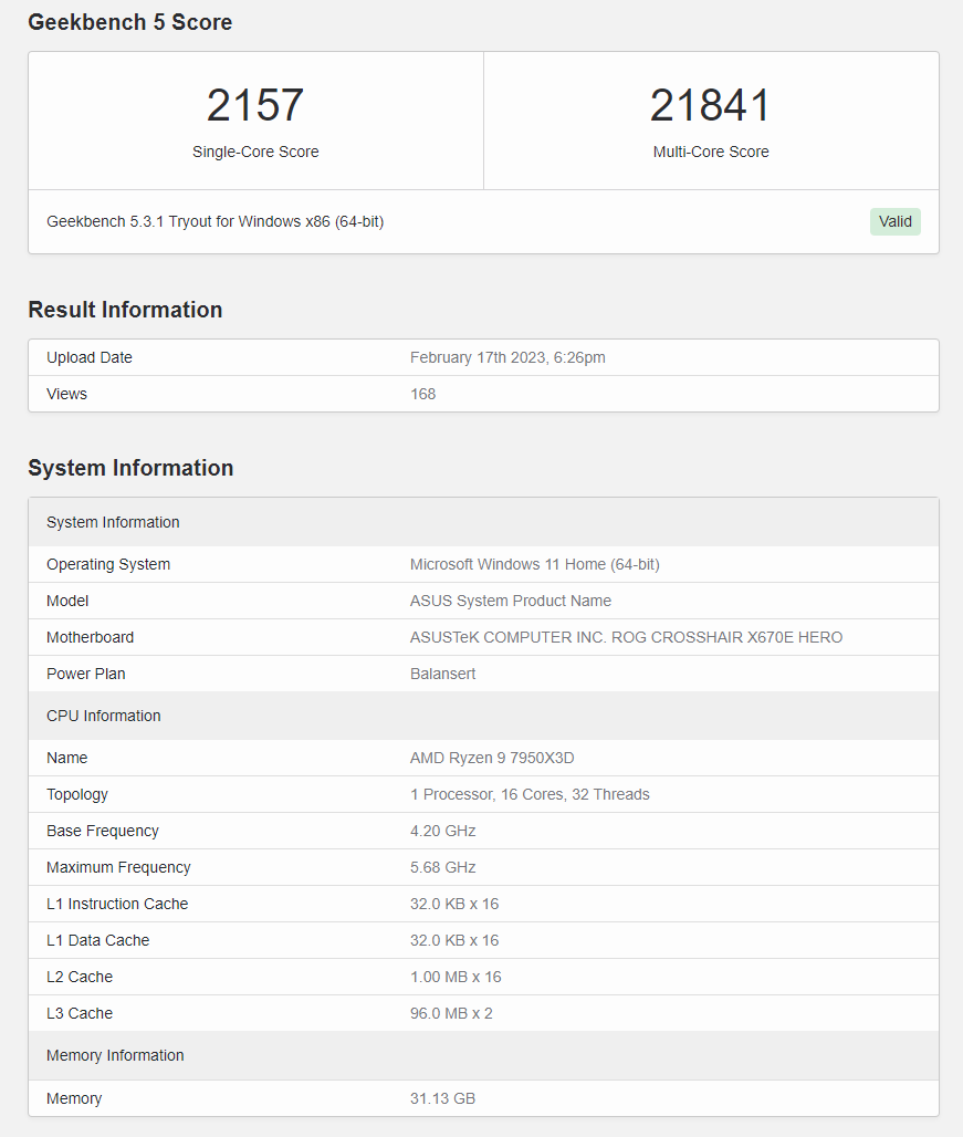现在,GeekBench数据库内第一次出现了锐龙9 7950X3D的身影,频率没问题,4.2-5.7GHz,但是三级缓存明显不对,应该是64MB原生、64MB堆叠,而不是两组96MB。