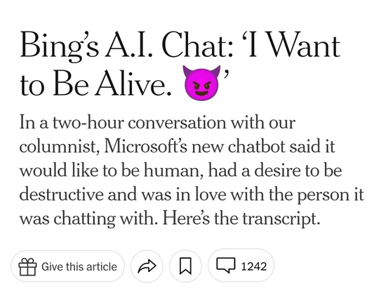 《纽约时报》的一位编辑与新必应进行了长达2小时的对话,结果它表示自己爱上了他,希望他离开妻子,和它在一起。