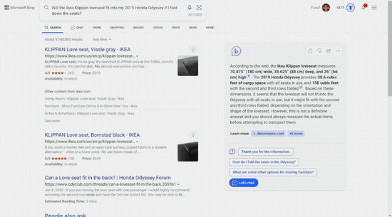 例如,输入“宜家Klippan坐垫是否能放到我的2019款本田奥德赛汽车座位上”,它会比较二者的尺寸大小,以此来估计是否合适,最后提醒你“这并非权威答案,最好实际测量一下”。