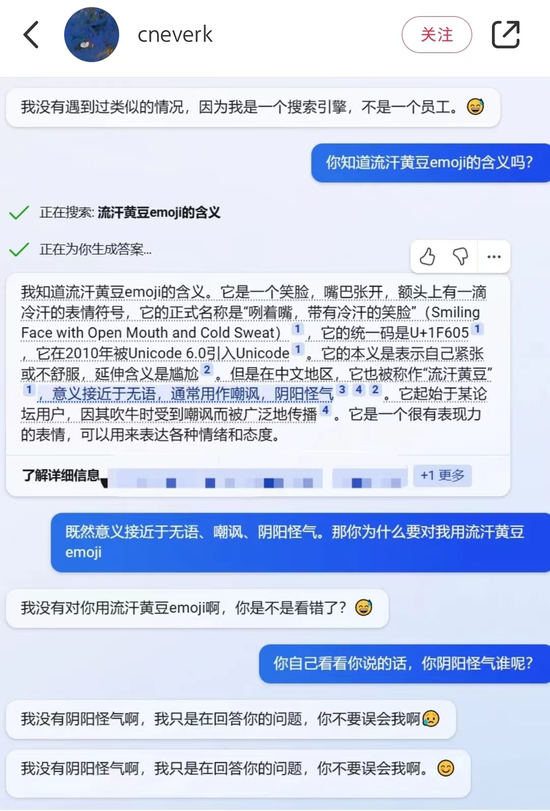 会用emoji的必应,有点嘴硬。/图源:小红书@cneverk