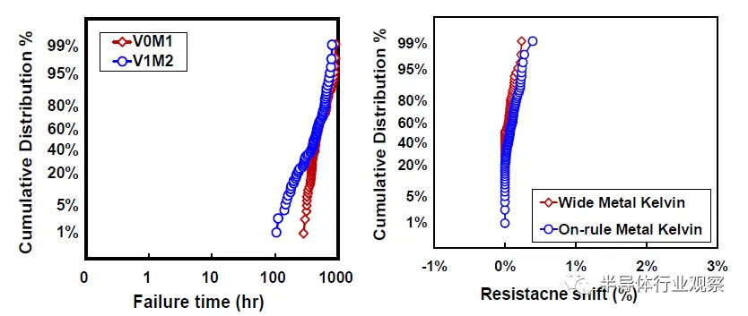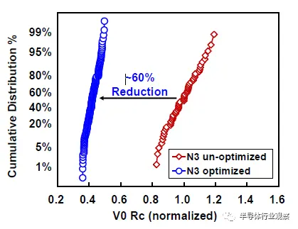 互连工艺在决定芯片整体性能方面发挥了越来越重要的作用。对于这种3nm技术,23nm处的最小金属间距用于实现FinFlex™ 2-1鳍配置的缩放,同时提供所需的布线效率。据我们所知,这是迄今为止在高级节点中报告的最紧密的金属间距。采用了创新的Cu衬垫,以将标称金属宽度的最小间距RC降低20%,将2X金属宽度的结构RC降低30%,如图12所示。基于图13中的创新屏障工艺,过孔Rc显著降低了约60%,这是实现这种激进间距缩放的重要组成部分。通过检查M0和Mx层的A线与B线的金属电阻,图14中A线和B线之间的可比分布证明了工艺的鲁棒性。在上部松弛金属节距以及ELK电介质处减少阻挡层厚度,以最小化总体BEOL RC延迟。图15显示了15级Cu/低k金属堆叠的横截面图。对于6级和15级金属,堆叠接触到通孔链的紧密Rc分布证明了该封装的稳定性。同时还对BEOL过程集成的可靠性进行了检验。图16(a)和16(b)分别验证了最小间距金属的Vx/Mx和Vx/Mx+1的优异EM性能和互连SM稳定性。在应力500小时后,具有规则和宽金属的Kelvin Rc结构的电阻偏移百分比可忽略不计。此外,上一代中需要EUV双图案化的三个关键层被单EUV图案化所取代,这降低了工艺复杂性、固有成本和循环时间。