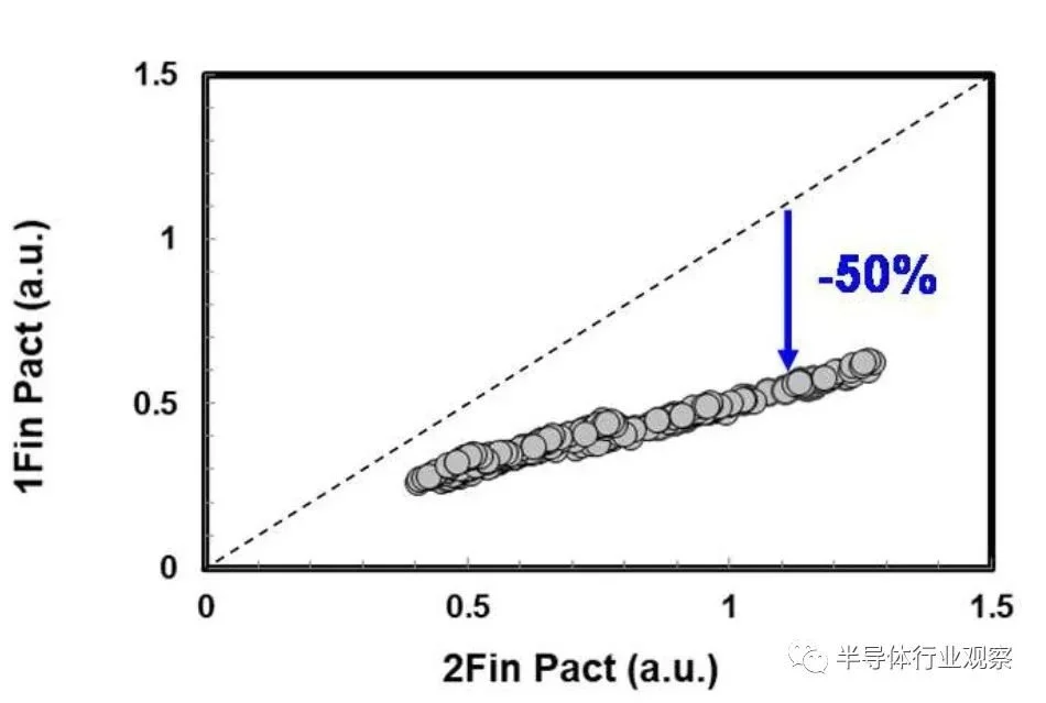 图7 1-fin器件显示出50%的有功功率降低,不存在工艺负载引起的退化。