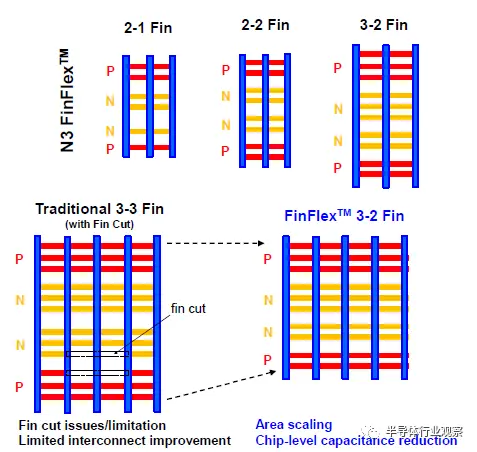 图1 FinFlex™示意图以及与传统方案的比较。与传统FinFET设计相比,面积减少和芯片级电容显著减少是该创新的主要优势。