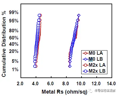 图14 A线和B线在大幅缩放间距下的M0/Mx金属电阻分布。
