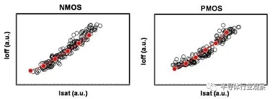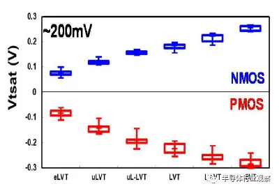 基于品质因数(FOM),该3nm技术的2-1鳍配置提供了18%的等功率速度增益,或在相同速度下比我们的5nm技术降低了34%的功率,如图3所示。我们优化了鳍的宽度和轮廓,以在目标缩放Lg(图4)处获得约50mV/V的DIBL,证明FinFET在3nm节点处仍然是可行的架构。FOM性能以及NMOS和PMOS器件分别实现了该技术的目标性能,如图5和图6所示。为了充分实现FinFlex™的预期效益,消除可能降低固有翅片性能的翅片数量差异引起的负载效应至关重要。单鳍器件尤其脆弱,因为许多工艺步骤,例如蚀刻和外延,自然地与多鳍结构所经历的工艺步骤不同。图7显示,经过工艺优化后,2-1鳍配置的单鳍器件与设计一样,其二鳍对应器件的有功功率约为50%。对于高速应用,如图8所示,3-2鳍配置的速度增加了9%以上。六种电压范围>200mV的不同Vt选项(图9)可供选择,以进一步提供电源性能权衡的设计灵活性。由于器件变化在设计裕度预算中变得越来越重要,因此我们还实施了专门针对对抗变化的工艺改进,以将NMOS和PMOS的器件Vt失配(AVt)降低20%,如图10所示。对于I/O器件,图11中的LDD注入优化根据SCE控制所需的鳍轮廓将Iboff降低了2个数量级以上。