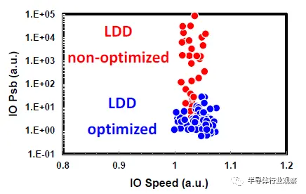 图11 I/O器件Psb与速度的关系。通过LDD优化,Iboff显著降低。