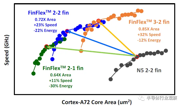 图2 ARM Cortex-A72中的FinFlex™改进。FinFlex™ 2-1鳍配置的目标是超功率效率、2-2鳍高效功率和3-2鳍超高性能。每种配置都显示了N5技术的不同面积、速度和能效改进。