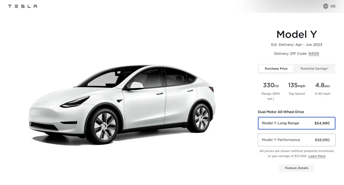 目前,特斯拉的购车热情尽显在官网的预计交付时间中。美国特斯拉官网显示,Model Y的交付时间最早已经排到2023年4月,即便这款车型在去年曾进行了两次价格调整,整体呈上升趋势。此外,Model Y在特斯拉中国官网的交付时间也长达2-5周,足以见得消费者们的热情。