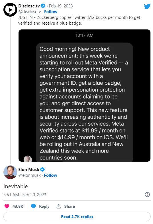 北京时间2月21日早间消息,据报道,就在最新的“Meta Verified”订阅服务发布后几个小时,Twitter CEO埃隆·马斯克(Elon Musk)就表示,Meta“必然”效仿Twitter,对认证用户收费。