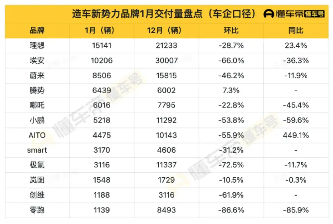 2023年以来,多家新能源车企的销量均出现同比下跌的迹象。懂车帝统计的造车新势力品牌2023年1月交付量盘点显示,仅有腾势一家车企的销量环比正增长,其他车企的销量不论是环比还是同比,均呈下跌态势。