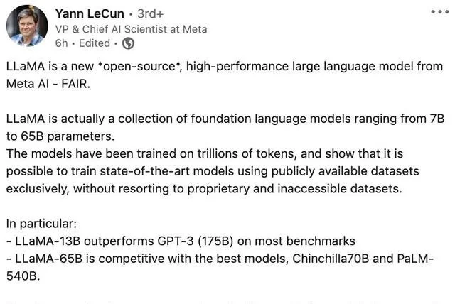 LeCun也在各种社交媒体上做了宣传,介绍说LLaMA是Meta AI的一种新的*开源*、高性能大型语言模型。