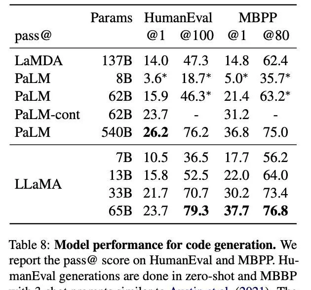 在代码生成基准上,LLaMA-62B优于cont-PaLM(62B)以及PaLM-540B。