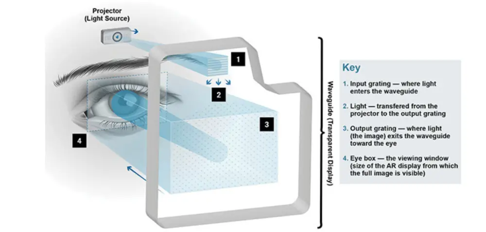上图展示了AR眼镜的成像原理,图片来源:techtarget