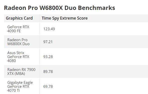 W6800X Duo拿到了97.21分,相比于华硕ROG STRIX RTX 4080高了大约4%,对比AMD新旗舰RX 7900 XTX也高了8%,但是仍然远不如RTX 4090,低了足有21%。