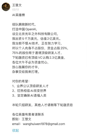 在王慧文的英雄帖中,也强调:“要狂热相信AI改变世界,坚定确保AI造福人类”。