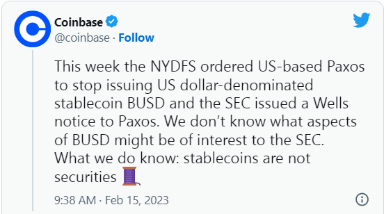 在Coinbase叫停交易之前,美国证券交易委员会(SEC)向Paxos发送了一张韦尔斯通知(SEC对在美上市公司进行民事诉讼前发出的非正式提醒),纽约州金融监管机构甚至命令Paxos停止发行BUSD。