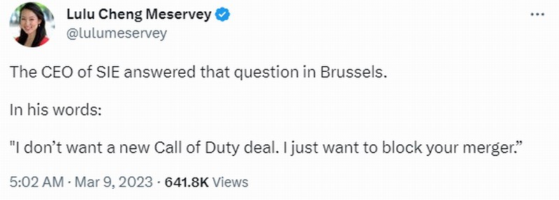 最近索尼互娱CEO吉姆·瑞安(Jim Ryan)坦言,他不想要什么《使命召唤》新协议,他只想阻止微软收购动视暴雪。今日(3月9日)动视暴雪高管Lulu Cheng Meservey透露为何索尼没有接受微软的《使命召唤》10年新协议,2月21日吉姆·瑞安在欧盟委员会监管机构举行的闭门听证会上说:“我不想要新的《使命召唤》协议,我只想阻止微软和动视暴雪合并”。