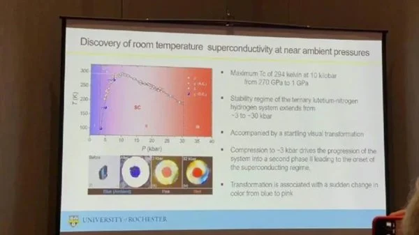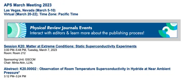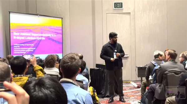 Ranga Dias在美国物理学会会议上,做了题为Observation of Room Temperature Superconductivity in Hydride at Near Ambient Pressure(近环境压强下观测到的金属氢化物室温超导现象)的报告。