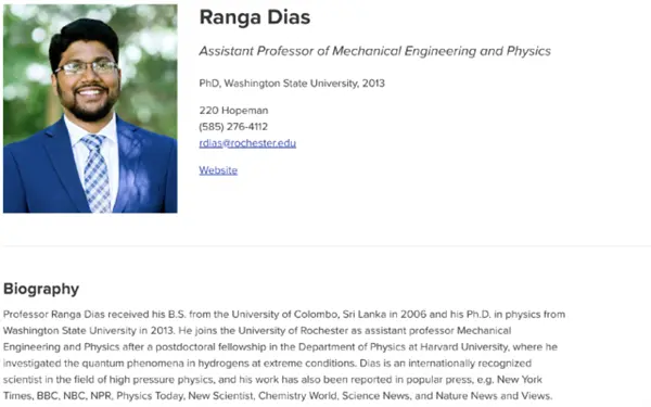 Ranga Dias是一位印度裔科学家,研究涉及高温超导、新型材料合成、高压NV光学磁力测量、高能量密度物理学等多领域。