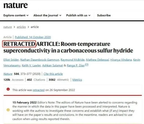 最终Ranga Dias和团队的论文在去年9月26日被《自然》杂志撤稿,理由是研究人员在研究关键数据处理、分析的有效性上存在违规行为。