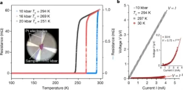 经过实验发现,基于氢、氮、镥组成的三元氢化物(N-Lu-H)材料,会在294K(室温21°C左右)的温度下,材料失去电阻,但仍需要在1GPa的压强下才能实现超导电性。
