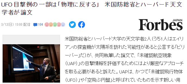 美国国防部与来自哈佛大学的两位天文学家日前发表最新论文,表示应严审未确认航空现象(UAP),因为其中有很多都是明显违反了物理定律。UAP是近期科学界出现的新词,是指UFO或者飞空的圆盘状物体。