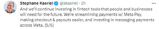 “我们将继续投资于未来人们和企业需要的金融科技工具。我们正在通过Meta Pay简化支付流程,让结账和付款更便捷,并在Meta上投资消息支付功能,” Kasriel说。