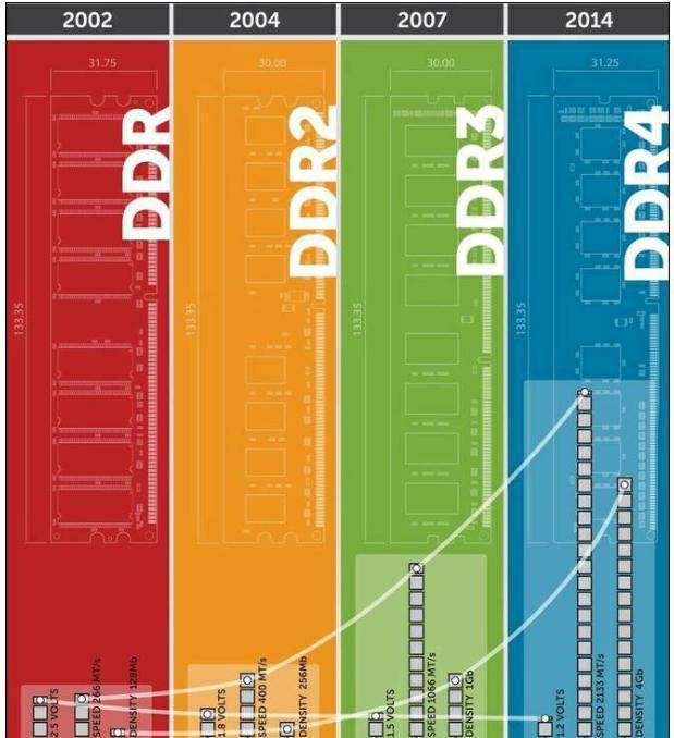 从奔腾二到奔腾四初期,电脑用的内存为SDRAM,常见有PC100、PC133等频率,内存带宽达到1064MB/s,但已经无法满足奔腾四4这个CPU的“胃口”,新一代内存呼之欲出。为了提升内存的带宽,以及达到独占市场的目的,Intel与一家叫做Rambus的公司联合推出了Rambus DRAM内存(简称为RDRAM)。