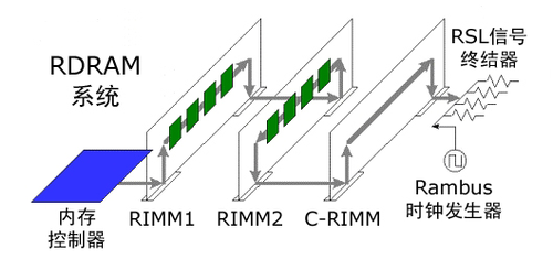 更有意思的是,Rambus DRAM采用了类似串行的数据传输方式,从下面的原理来看,数据依次通过RIMM1到RIMM2,因此Rambus DRAM内存必须要成对使用,可以说是“返古”了。
