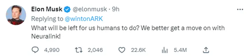 他在Twitter平台上发文称:人类还能做什么?我们最好使用Neuralink(来对抗人工智能)!