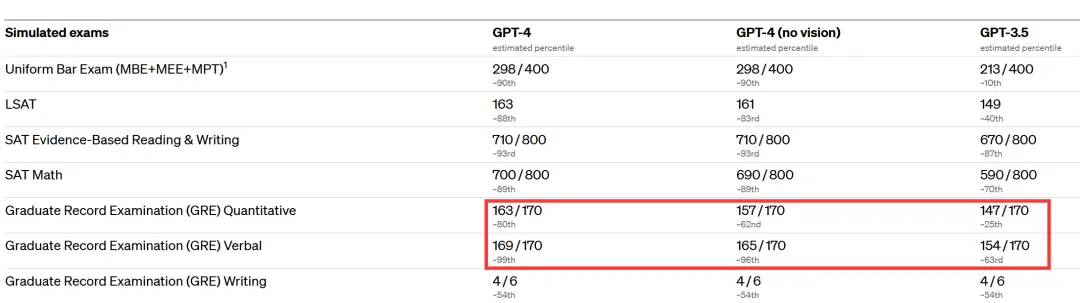 根据官方的宣传,新推出的gpt-4在各项考试中的成绩远超gpt-3.5,在很多专业和学术上的表现达到了人类水平,甚至在GRE(美国研究生入学考试)的两科中已经达到了顶尖大学生水准。
