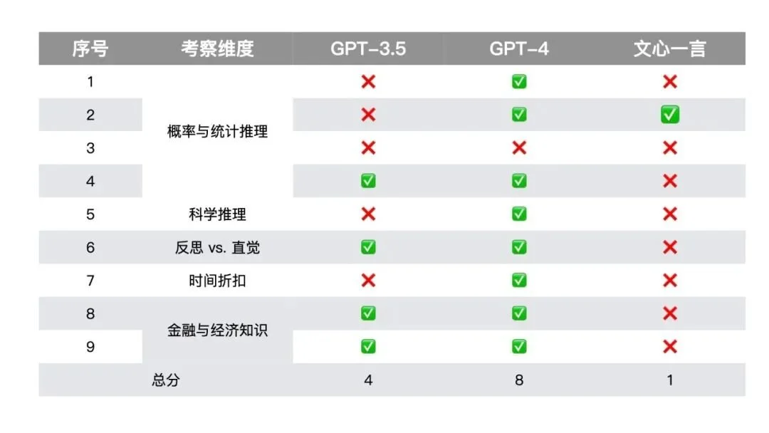 而有三道题,要么是答案正确,但是解释错误;要么是同样的提示语,但有时答案正确,有时答案不正确,并且解释不够对。这类测试结果,我们都统一判为错。