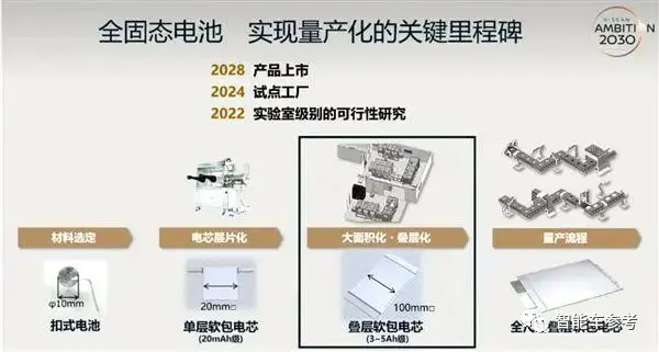 丰田计划在2025年前实现全固态电池小规模量产;日产宣布将在2025年生产第一批低成本固态电池,并计划于2028年生产一款由固态电池提供动力的全新电动汽车;宝马计划在2025年前推出应用固态电池的原型车,并于2030年前应用于量产车。