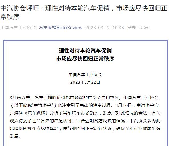 3月22日,中国汽车工业协会发布了一份《理性对待本轮汽车促销 市场应尽快回归正常秩序》的评论文章。其中指出,3月份以来,汽车促销降价引起市场端的广泛关注和热议。中国汽车工业协会结合近期各方反映的情况,中汽协会认为此轮降价的炒作应尽快降温,使行业回归正常运行状态,确保全年行业健康平稳发展。
