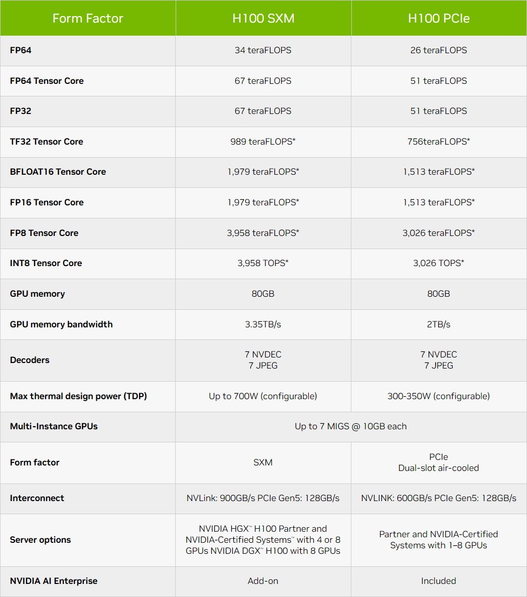 两种样式,其中SXM版本15872个CUDA核心、528个Tensor核心,显存带宽3.35TB/s,NVLink带宽900GB/s,PCIe 5.0带宽128GB/s,热设计功耗最高700W。