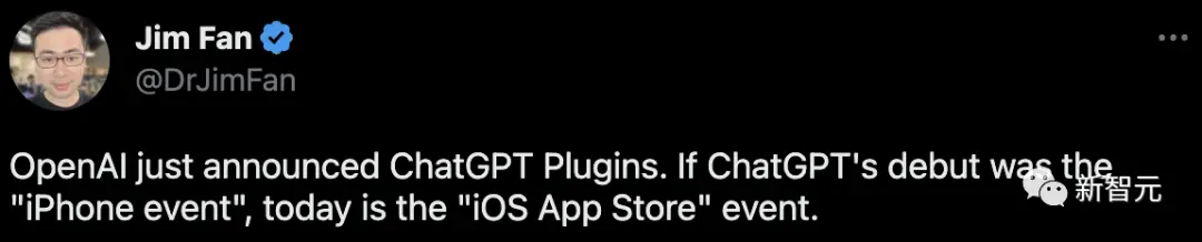 李飞飞高徒、英伟达AI科学家Jim Fan激动地说,如果说曾经ChatGPT的横空出世可以看作“iPhone的出现”,今天第三方插件的集成,就是“iOS App Store”级别的事件。