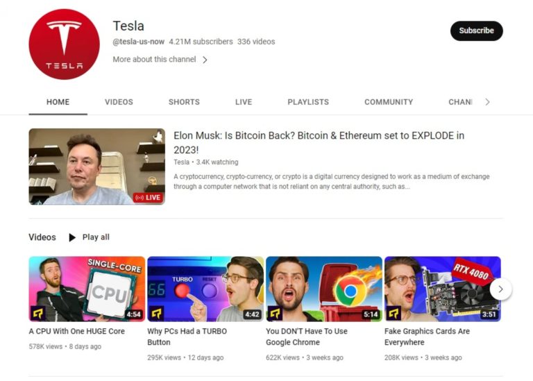 Linus TechTips 的主油管频道在早些时候被攻破,频道名被改为“特斯拉(Tesla)”,黑客开始了直播,主要是特斯拉CEO 马斯克讨论加密货币的内容,随后账号被封禁。虽然视频没什么问题,但一般这种视频的描述里都会附带“免费加密货币大放送”之类的诈骗链接,黑客将通过这些网站窃取遭骗用户的个人信息。