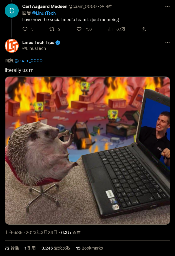 比较有意思的是 Linus TechTips 的社交媒体员工。毕竟他们也没什么事情可以帮倒忙,于是只能在推特上发一些梗图。例如旗下子频道,专门讨论苹果硬件的 MacAdress 推特账号就嘲讽 Windows “有安全问题”,因为他们的频道无事发生。