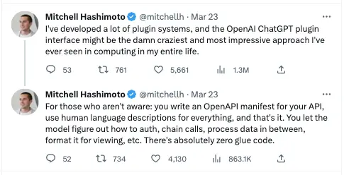 根据一位名为Mitchell Hashimoto的资深开发者表示,ChatGPT Plugins的插件开放流程极具颠覆性。用他的原话,整个开发界面是他从事计算机生涯见过最疯狂也最让人印象深刻的事。他表示,开发者只需要定义API,然后用自然语言描述清楚这个API是什么、有什么功能,然后ChatGPT就会自己弄清楚身份验证、链调用、数据处理等一系列的工作。整个过程非常简单智能。
