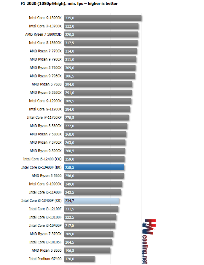 各个项目中,B-0版本领先幅度最大的是《F1 2020》,平均帧数领先了5%,不过最低帧数的差异会大一些,领先幅度达到10%。