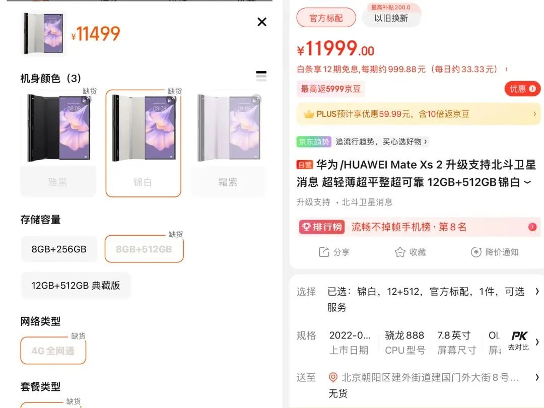 一位北京市昌平区华为授权体验店的工作人员告诉燃次元,现阶段华为折叠屏手机卖得最好的就是“HUAWEI Mate Xs 2”,但也基本没有现货,“不管是Xs2还是Pocket s,都要看你想要什么配色、什么配置的机子,我去看看库房有没有货。”