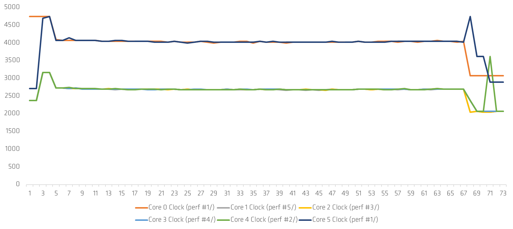 其中,大核频率范围4.0-5.0GHz,平均4.2-4.3GHz左右;小核频率范围2.5-4.0GHz,平均略低于3.0GHz,偶尔可以冲到4.0GHz。