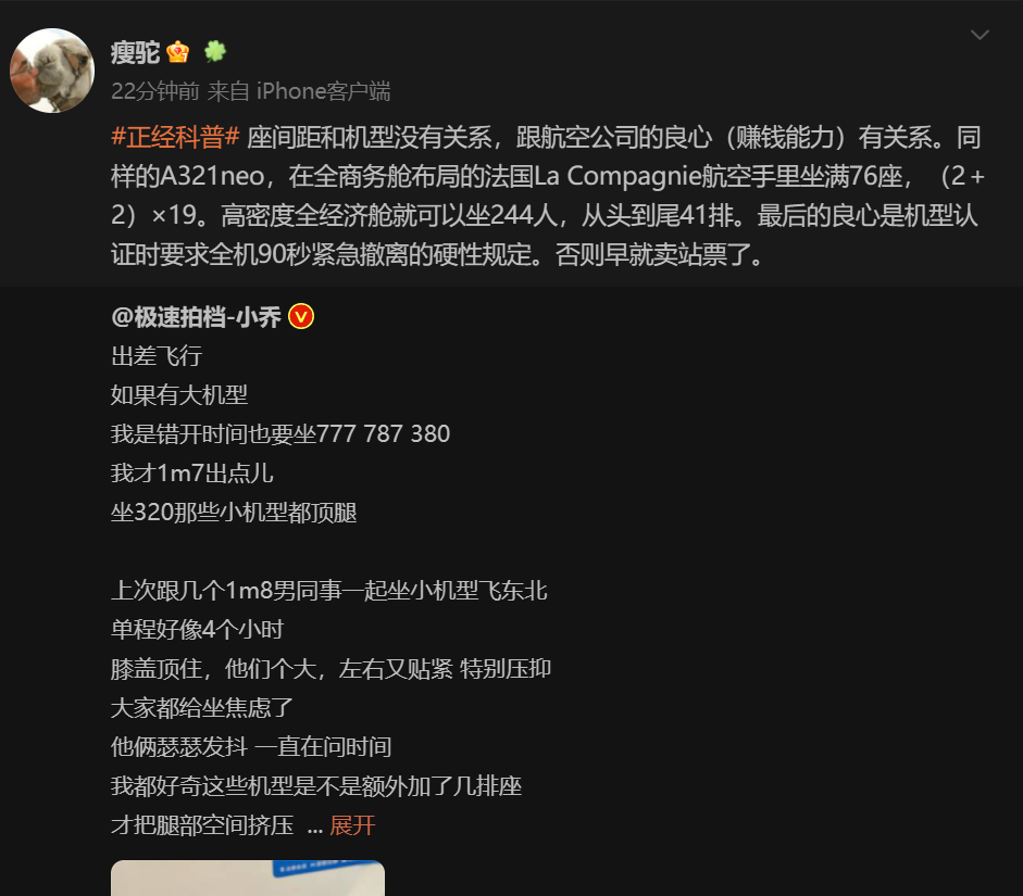 近600万粉丝的科普大V@瘦驼科普了飞机座位的问题,指出座间距和机型没有关系,跟航空公司的良心(赚钱能力)有关系。