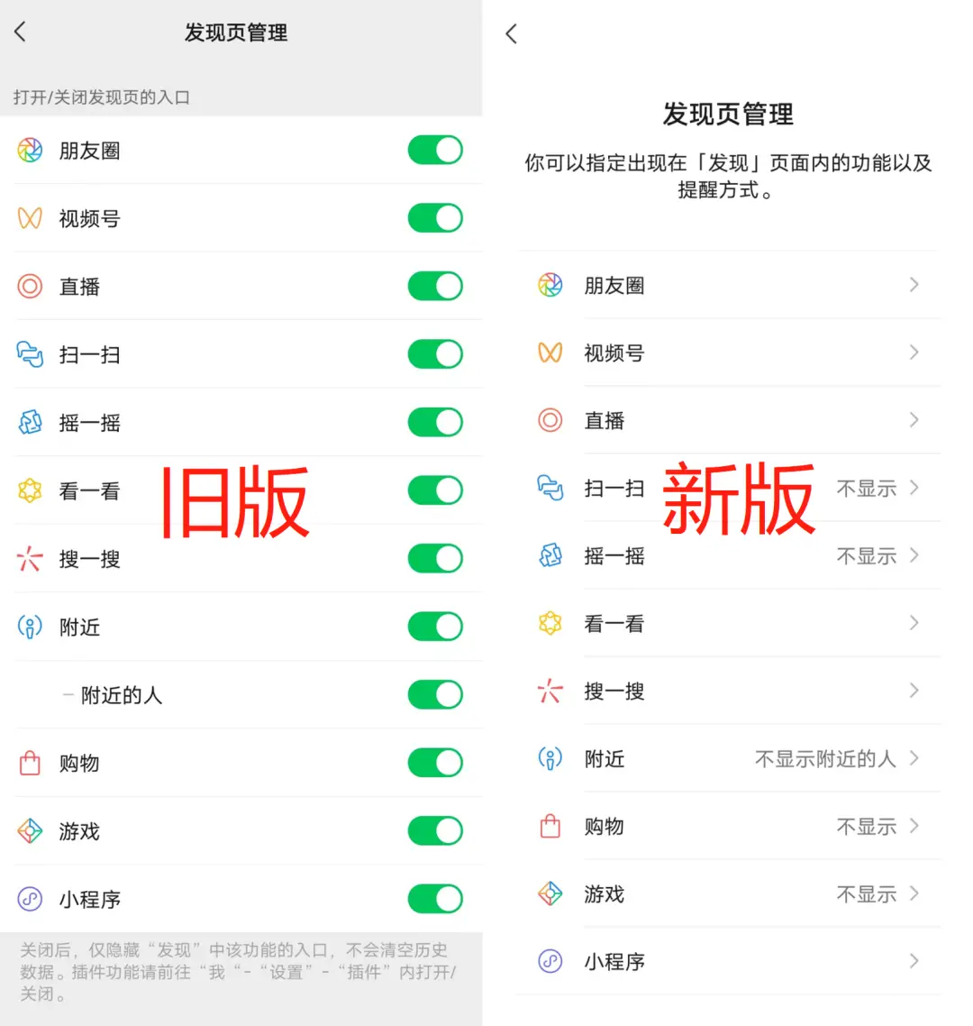 其次把消息提醒中的朋友圈、视频号部分整合到发现管理页,设置起来更为便捷。