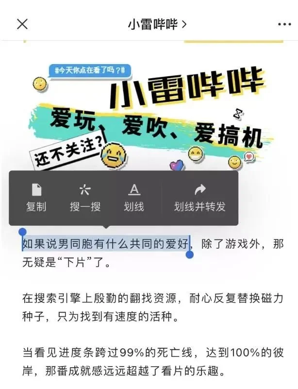 旧版微信随意打开一篇文章,对着文字长按屏幕可调出功能栏,启用划线、划线并转发2个内测功能。
