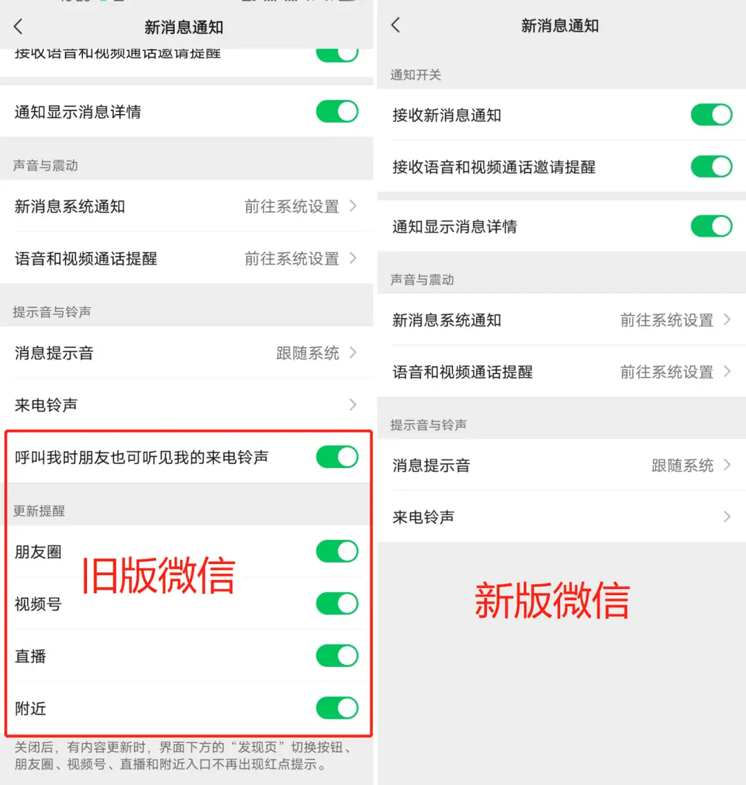 新版微信删除了大部分消息提醒的开关,包括朋友圈、视频号、直播、附近。